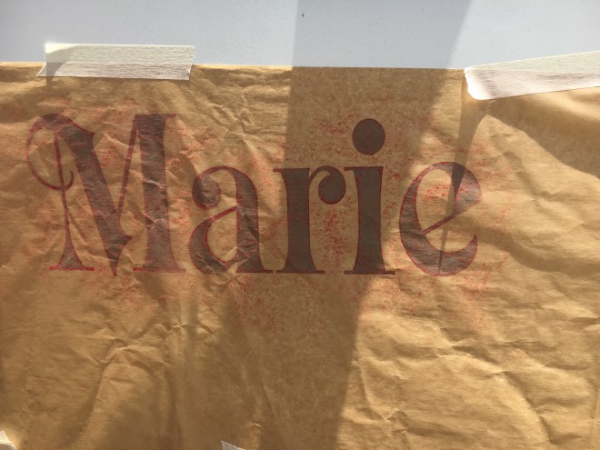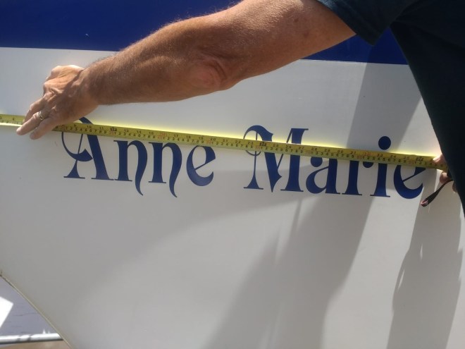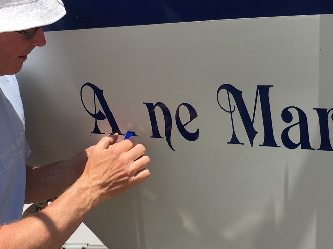 When painting a boat one has to plan for repainting the name. Here we are measuring the X height and font width as well as taking a ‘brass rubbing’.