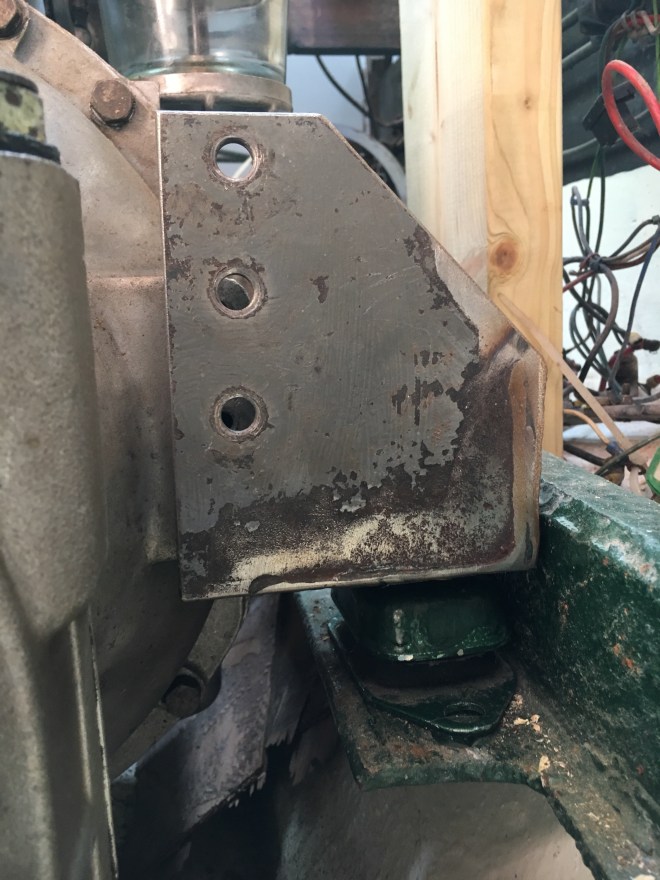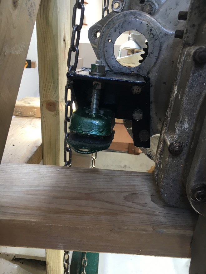 The engine is now under the floor and I have completed the rebuilding of the engine mount support brackets. These are now fixed to the engine which is roughly aligned in place.