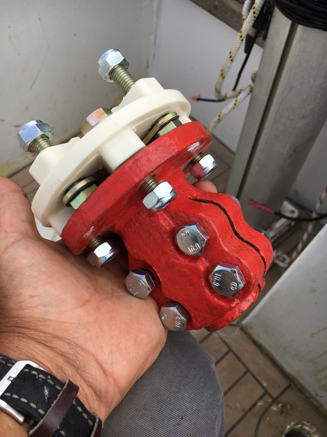 I have had some difficulty in dealing with the flexible coupling between the engine and propeller shaft. This is because the output shaft of the gearbox is a two bolt affair and the flange that is fixed to the propeller shaft has four bolts. This is meant manufacturing a conversion.
