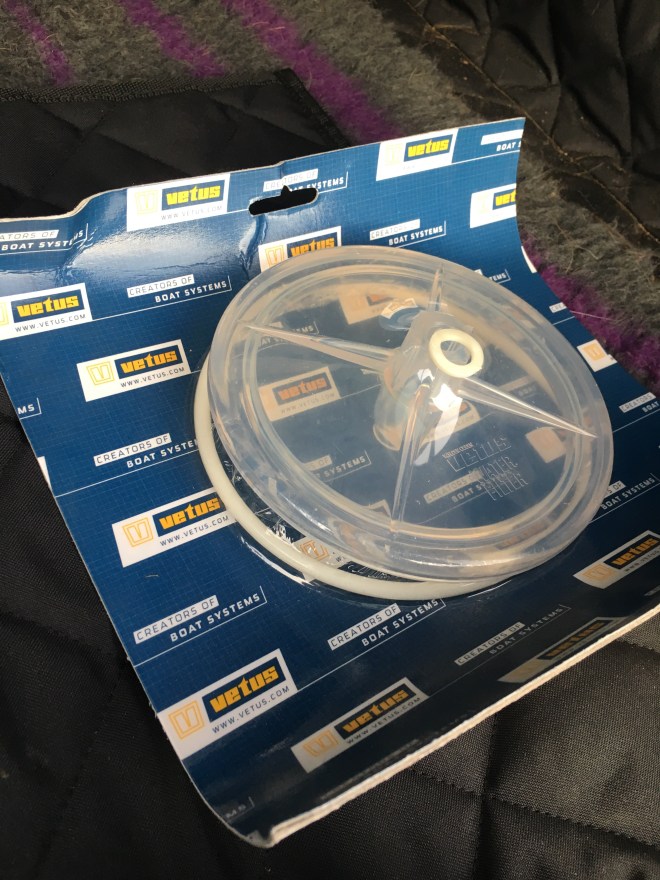 Otherwise I have almost finished the engine cooling system. The raw water pipe work is now complete and all connected but when I tested it with a hose pipe water cascaded out of the primary filter. Fortunately a spare kit can be bought from Venus and that arrived in the post a couple of days ago. This has a new lid which was cracked and two new rubber seals. That should do the trick.