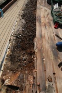 The deck is actually made up of three parts. The fibreglass moulding which is then covered with plywood and then strips of teak have been put on top. This teak layer has had the fibreglass put on it because the teak was moving. This by the way was the wrong thing to have done. The more the water got in the more the plywood core has rotted away.