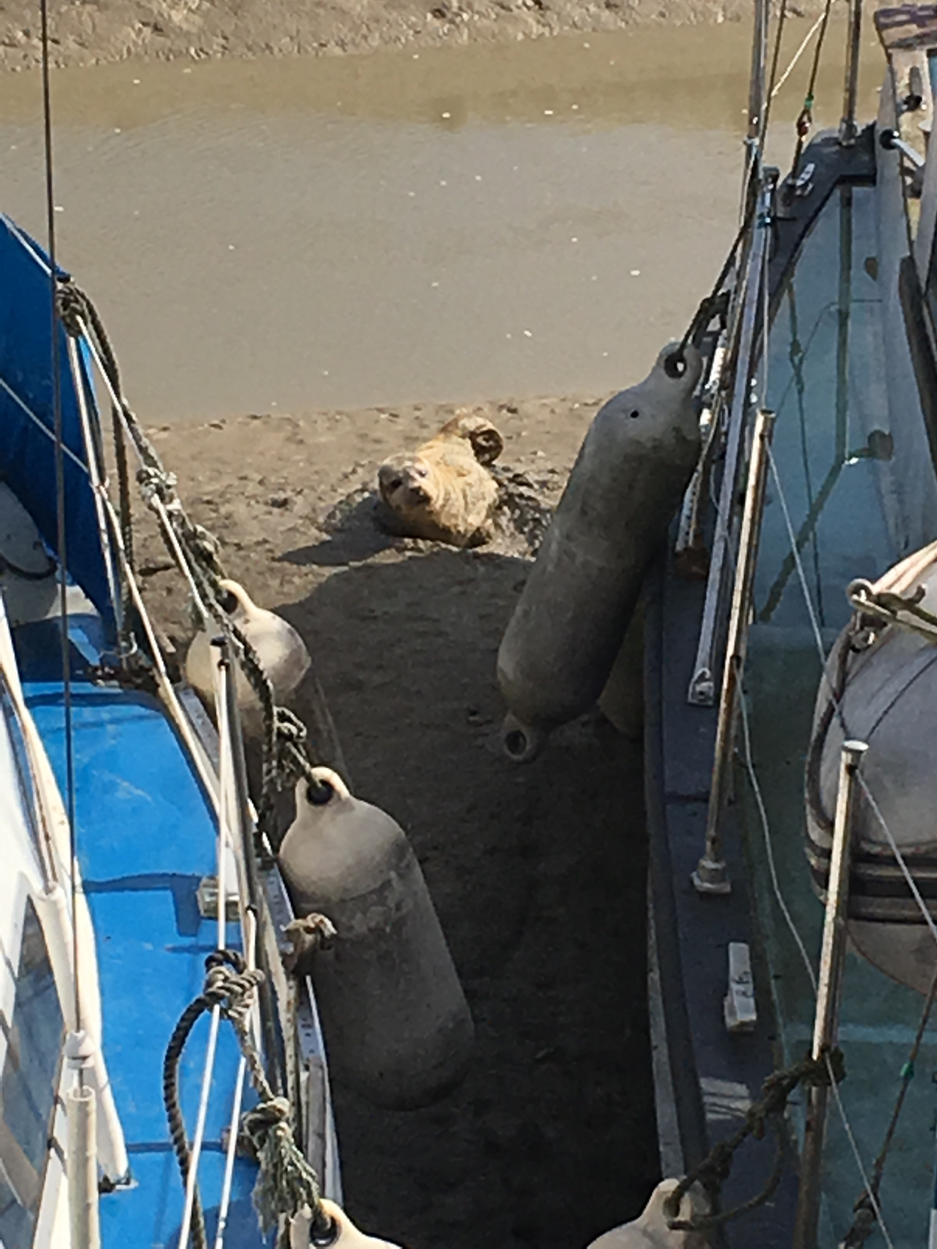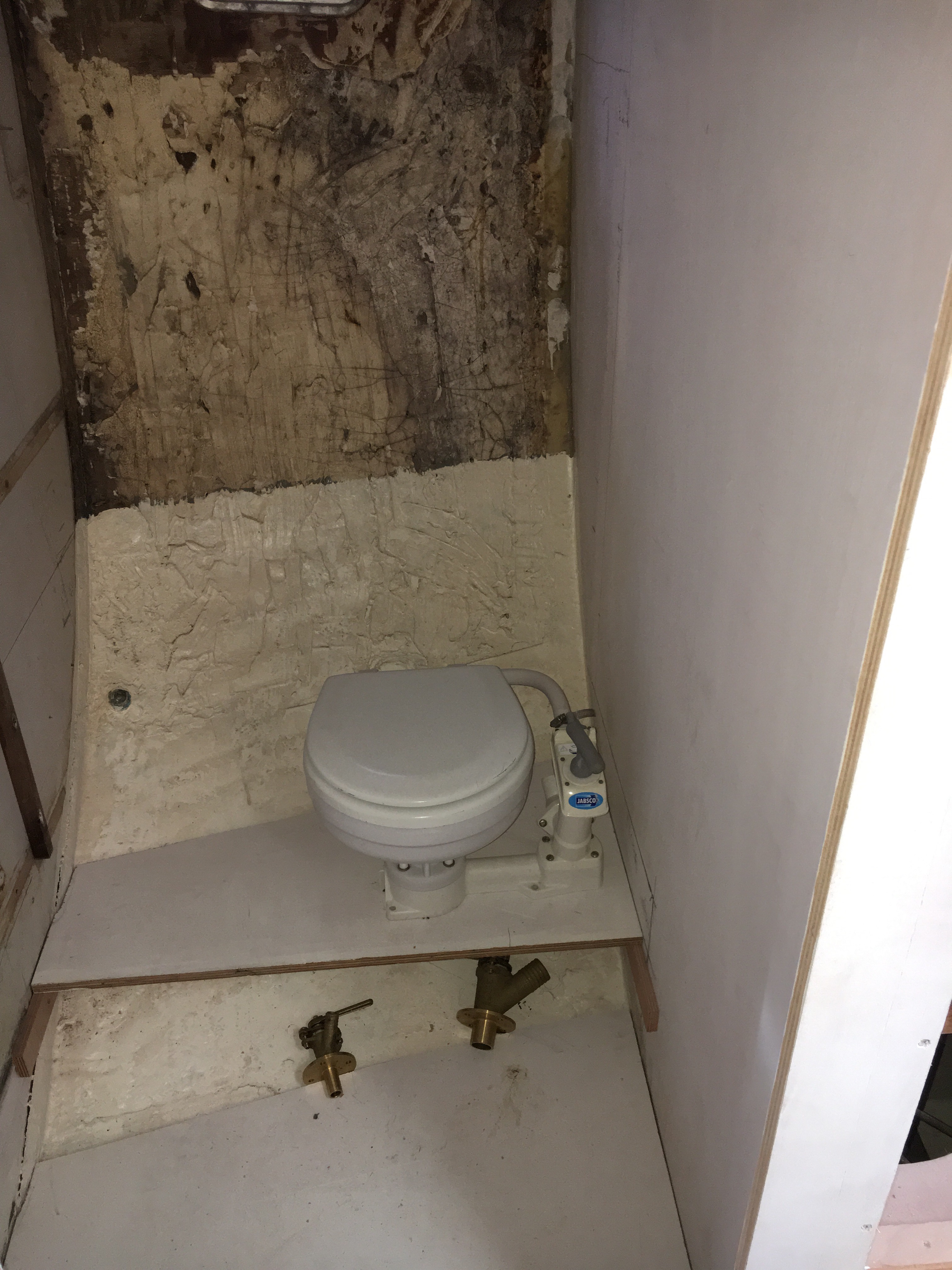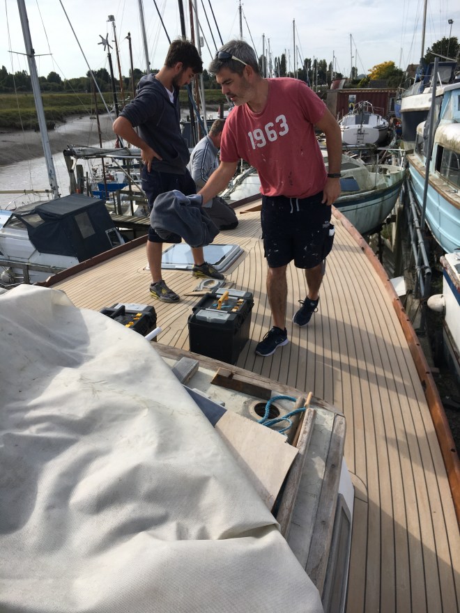 The cabin is a GRP moulding formed and then lowered onto the side ledge of the hull. Some months ago we spent some time levering the two pieces apart and filling them with sealant before bolting them back together again and covering them with a plywood deck.