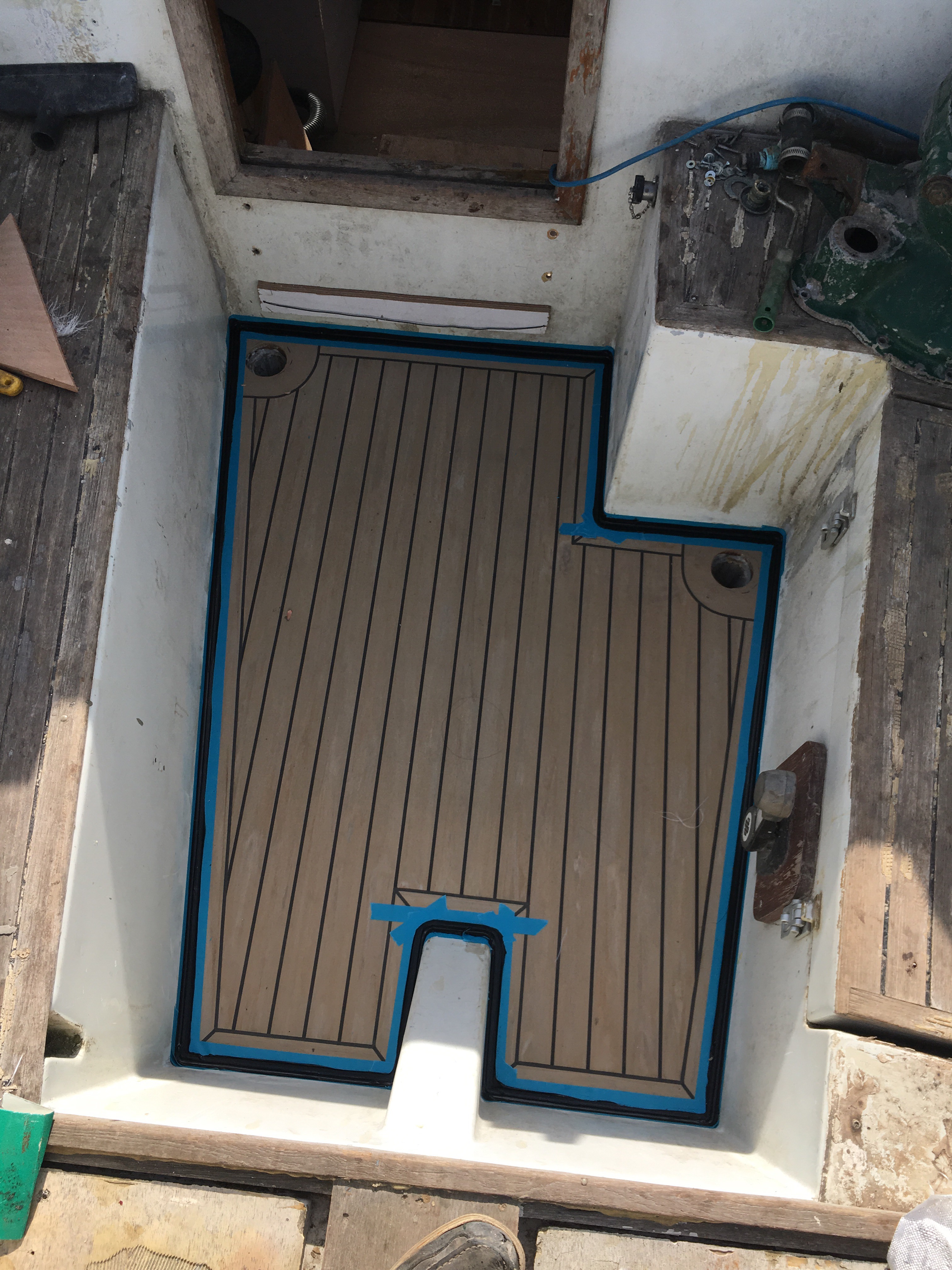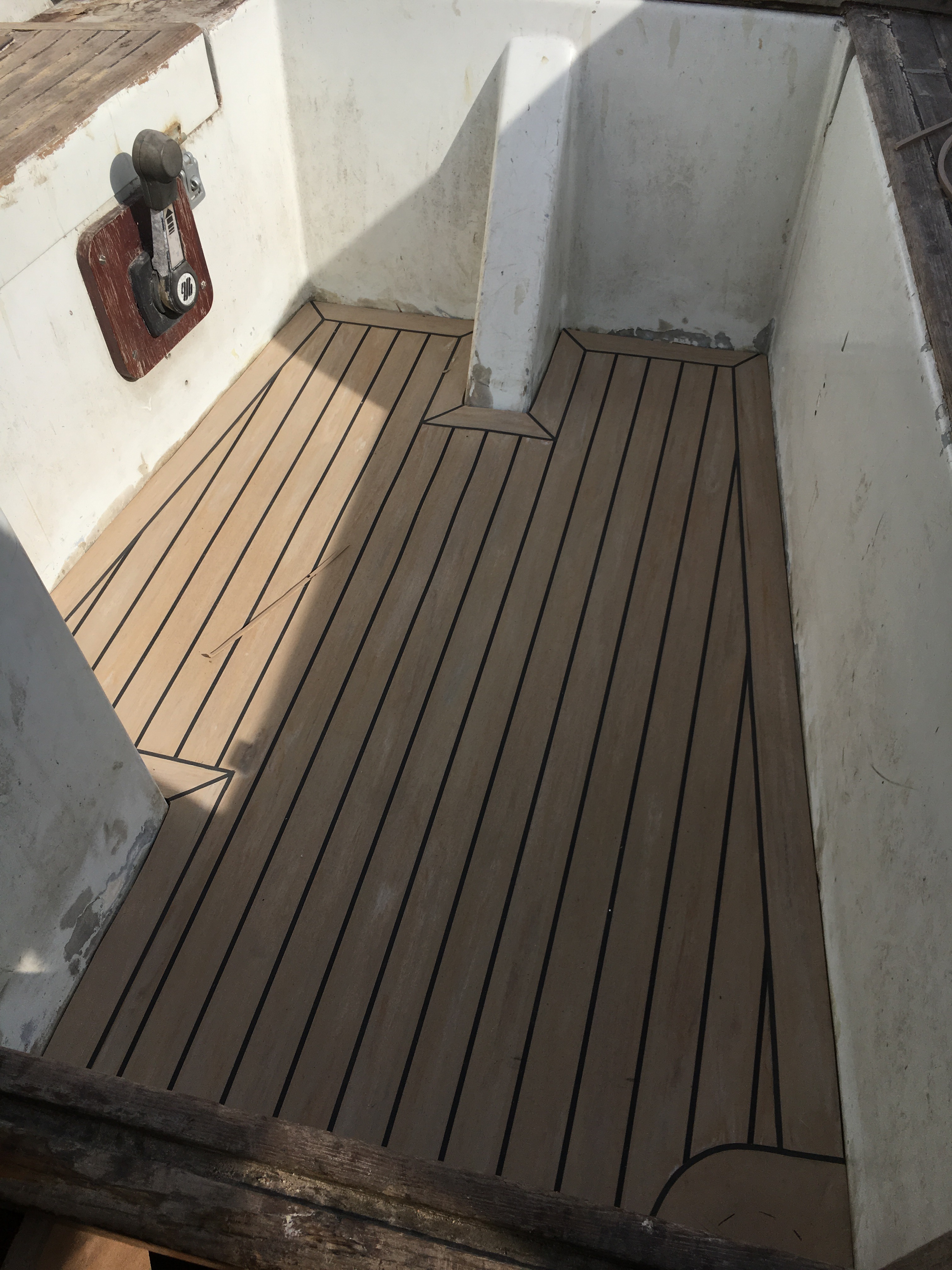 The deck is actually made up of three parts. The fibreglass moulding which is then covered with plywood and then strips of teak have been put on top. This teak layer has had the fibreglass put on it because the teak was moving. This by the way was the wrong thing to have done. The more the water got in the more the plywood core has rotted away.