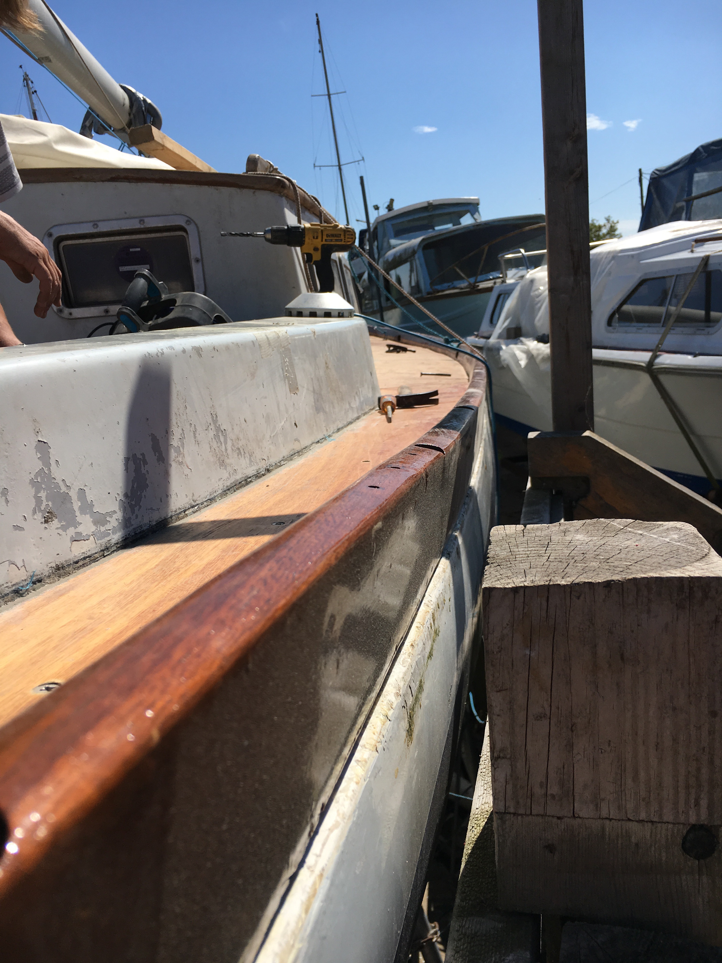 11. Removed final sections of toe-rail as well as bow-sprit. All sanded down and ready for new Coelan paint system