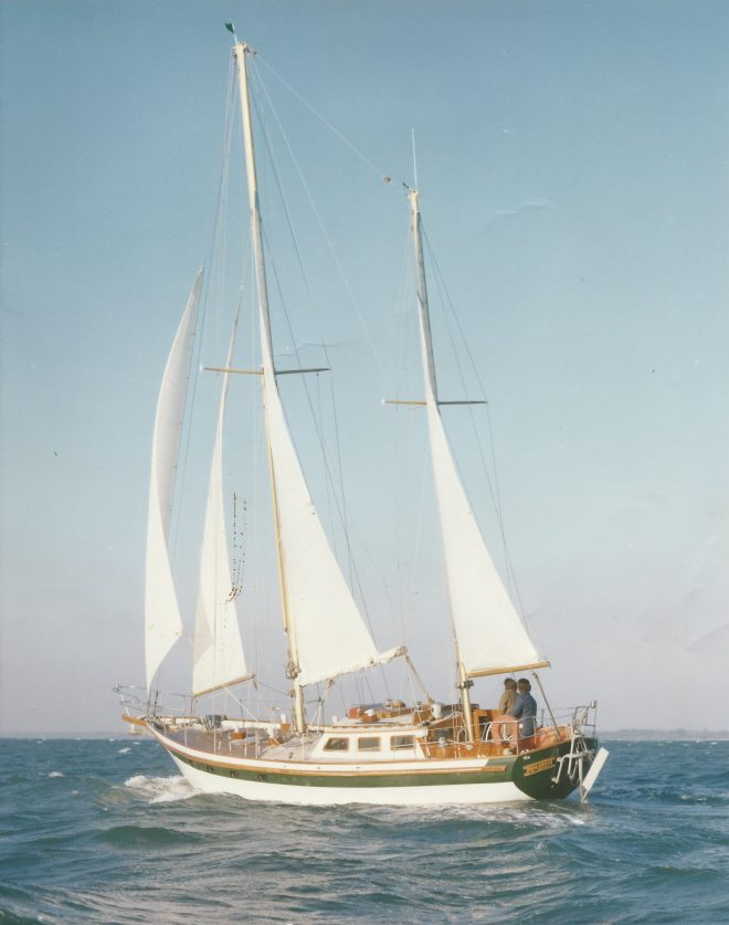 Tyler Boat Company promotional photo of Endurance 35 “Malaboo of Birdham” c1978