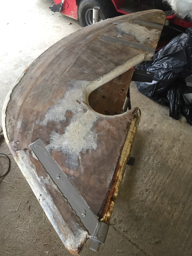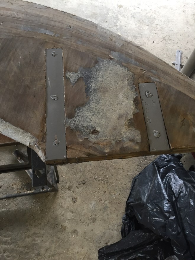So the first job is to apply a coat of ordinary polyester resin to allow that to soak into the wood and go tacky. Then I shall put on some fibreglass matting and stick that down with more resin. Then will come some filling and protection of the edges that will need some additional fibreglass tape. More photos to come.